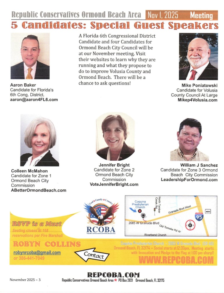 Please come to the Republic Conservatives Ormond Beach Area meeting this Saturday and hear Mike Speak about the issues affecting you. 1 pm! See flyer for location.